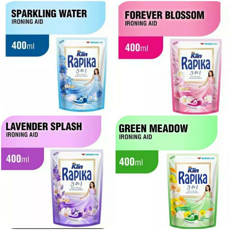 Produk pelicin pakaian dengan fungsi lengkap. Selain membuat pakaian rapi, melicinkan pakaian, dan tidak menimbulkan bercak pada pakaian, So Klin Rapika mengandung formula anti jamur dan penyegar pakaian yang efektif mencegah timbulnya jamur pada pakaian yang disimpan di lemari. So Klin Rapika jadikan pakaian lebih awet, harum, rapi, dan higi
