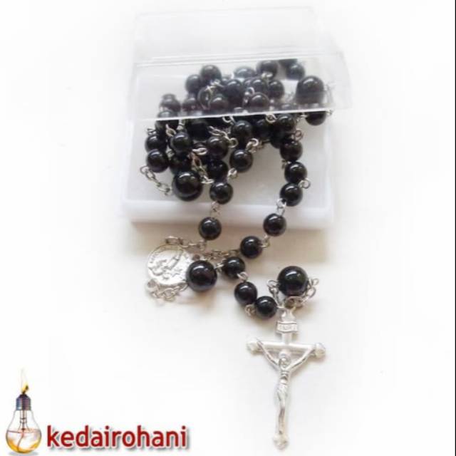Bahan: Manik black onyx(6 mm + optional Bapa kami 8mm), Paku 9, rantai, ring, Herces dan Salib.Panjang rankaian manik utama kurang lebih 60 cmPanjang dari Herces ke Bandul Salib kurang lebih 8 cmHarga sudah termasuk kotak rosari