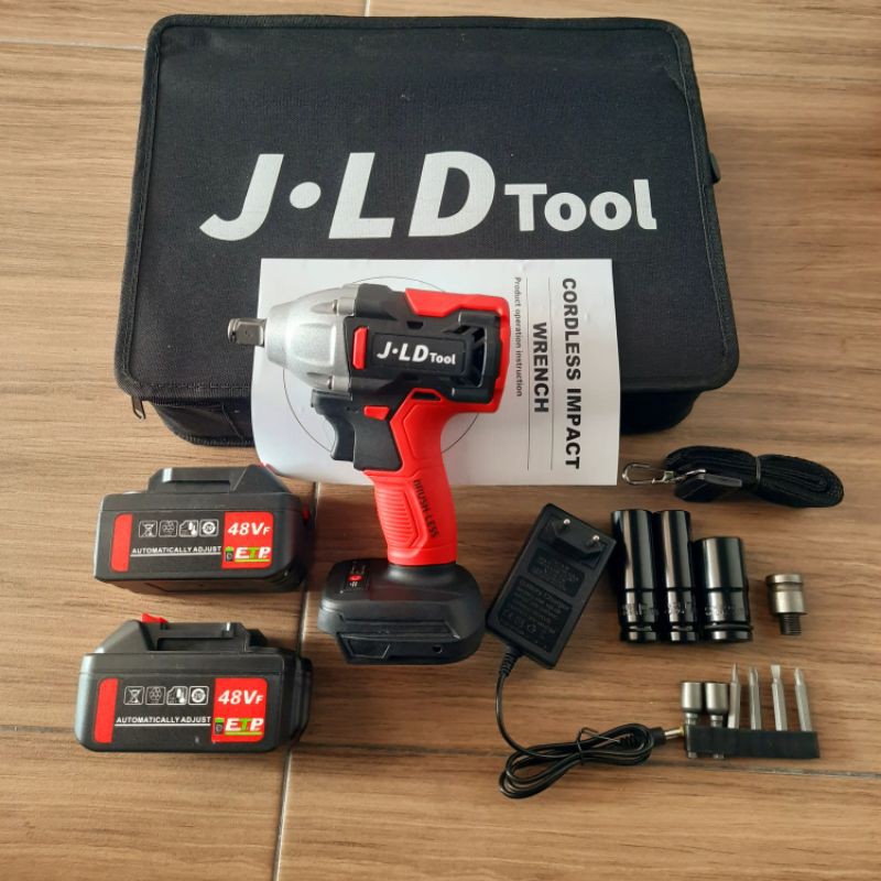 Mesin Cordless Impact Wrench Brushless 48V JV88 JLD / Bor Baut Baterai- Tegangan 48 Volt- Max torque 330Nm- Use brush-less engine- Kecepatan 0- 3000 RPMKelengkapan :- 1 Unit mesin- 2 unit baterai 48V- 1 Charger- 1 sabuk- 3 kunci Socket : 19mm, 21mm, 22mm- 1 adapter socket drat 1/2inch- 1 Tas bor#jldtool