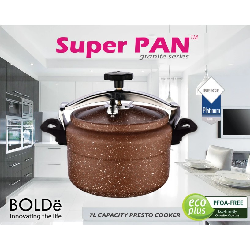 Pertama di Indonesia presto cooker dengan polished granite coating berkapasitas 7 L.Memasak daging hingga empuk dengan cepat , praktis dan effisien.Dengan dasar induksi sehingga bisa digunakan untuk kompor induksi.Regulator tekanan yang dirancang khusus sehingga tekanan pada saat memasak dapat terjaga dengan stabil secara otomatis.Dilengkapi indikator pengunci di bagian penutup sehingga mencegah penutup terbuka jika produk masih dalam posisi digunakan dan masih ada tekanan di dalam panci.Bebas bahan kimia PFOA yang membahayakan untuk kesehatan