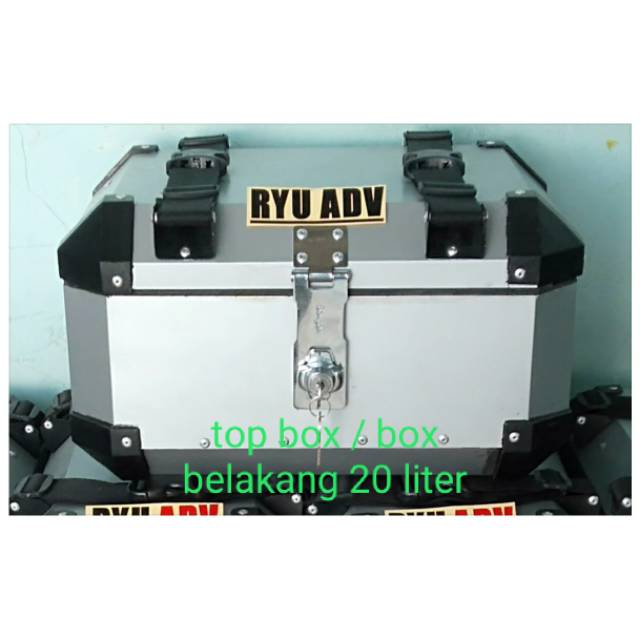Top box 20 liter universal bisa di pasang ke semua jenis breket tinggal di sesuaikan saat pemasangan .bebas riquest warna tanpa biaya tambahan mohon untuk cantum kan warna saat pemesanan . bahan galvanis anti karat . kelengkapan baut + plat penjepit ke br