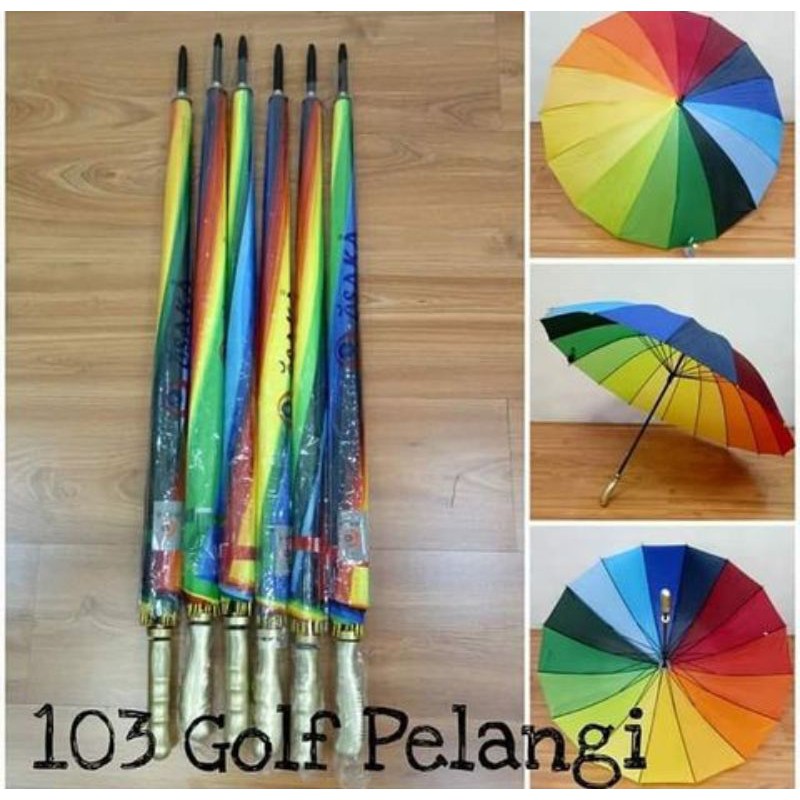 Payung golf pelangi 103Rp.38.000/Pcs.- Di luar rangka berwarna warni seperti pelangi warna cerah dan menarik- Tiang besi anti karat- Bahan polyester yg berkualitas...Menerima pesanan&penjualan ecer/grosirPesanan dalam jumlah byk ada harga grosir..Grosir minimal 1l