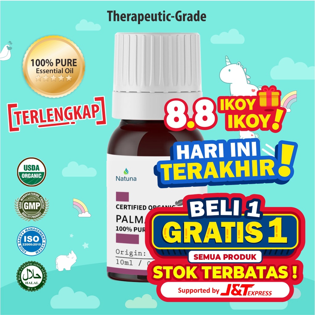 Shopee 8.8 Ikoy IkoyHARI INI TERAKHIRBELI 1 GRATIS 1 Semua Produk( u/ Produk yang Bertanda Khusus B1G1 )Stock Sangat Terbatas~===================Natuna Palmarosa Essential Oil=============================Size: 10mlCode: N100087Type: Pure Essential OilGrade: Therapeutic-gradeCertified: OrganicOrigin: IndiaLatin Name: Cymbopogon Martinii============================= Manfaat Palmarosa Essential Oil :================== Menurunkan panas dan demam karena memiliki sifat antivirus, antibakteri dan antiseptik. Memiliki sifat bakterisida yang berarti mampu menghambat pertumbuhan bakteri. Dapat digunakan sebagai Anti Virus & Anti Infeksi yang efektif. Mampu mempromosikan pertumbuhan sel dan siklus materi selular.Beberapa Tips Cara Pemakaian : Diteteskan 2-10 tetes pada Diffuser sebagai Terapi u/ memberikan efek rileksasi & mendapatkan manfaat dari Essential Oil. Dicampur dgn Natuna Carrier Oil, Oleskan pada leher & pijat u/ manfaat ketika diluar rumah atau ruangan. Diteteskan Random / Acak disudut2 rumah / apartmen untuk menghilangkan bau tak sedap secara instant.===============Natuna Essential adalah Brand Lokal u/ Essential Oil dgn Standard International ( ISO ) & Therapeutic Grade dgn Variant Essential oil TERLENGKAP di indonesia.*FREE BUBBLE WRAP, BOX AND LOVE DARI NATUNA ESSENTIAL Lᵒᵛᵉᵧₒᵤ♥#EssentialOil#Aromatherapy #Therapeuticgrade#PalmarosaEssential#Diffu