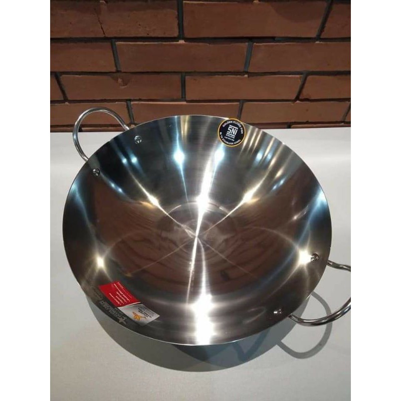 Inovasi terbaru dari Golden Flying Fish, Wajan Stainless Steel Harden. Diproduksi dengan treatment khusus yang membuat wajan menjadi tidak lengket saat menggoreng (namun harus tetap menggunakan minyak).Wajan ini menggunakan material Stainless 430 yang memilikiSertifikat SNI 8752:2019Kelebihan Wajan Wok Stainless Steel Golden Flying Fish:- Food grade- Bersertifikat SNI 8752:2019 (Standar Nasional Indonesia)- Tidak lengket. Panas lebih merata dan hemat energi- Higienis dan mudah dibersihkan.- Hemat energi karena lebih cepat panas- Lebih tebal, kuat, dan tahan lama. Tidak rontok saat proses memasak- Tidak mengubah rasa atau menimbulkan reaksi kimia pada makanan yang dimasak.*harga naik per 1 maret 2021*untuk jasa kirim grab instan atau Id express silahkan chatt sellerUntuk pembelian banyak silahkan chatt seller terlebih dah