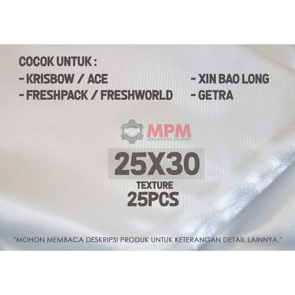 Plastik Vacuum ini Food Grade / BPA FREE dan sudah bersertifikat FDA, sehingga aman untuk menyimpan makanan.Bagi Anda yang menggunakan plastik untuk menyimpan makanan, pastikan plastik yang anda gunakan 100% BPA FREEKemasan ini sangat cocok utk menyimpan makanan atau bahan makanan kedap udara. Seperti beras, kopi, kacang-kacangan, maupunfrozen food.Plastik vacuum ini didesign special untuk Mesin vacuum sealer yang membutuhkan plastik vacuum yang memilikirongga atau tekstur di salah satu sisinya (seperti vacuum sealer FRESHPACK, FRESH WORLD atau KRIS).Spesifikasi:- Size 25 x 30 cm ( Lebar x Panjang)- Tebal 80-90mic (1 sisi), atau total 160-180mic utk 2 sisi- 1 sisi POLOS, 1 sisi Texture Motif Wajik- Harga per SATU pack isi 25 lembar- FOOD GRADE Quality- Bahan NylonBerat produk + packing ... +/- 350 Gram===PENTING!1). Mohon PASTIKAN DETAIL ORDER dan ALAMAT PENERIMA Anda sebelum mem-bayar.Bila ORDER yg DIKIRIM SUDAH TEPAT sesuai dengan INVOICE = TIDAK DAPAT DITUKAR/ DIKEMBALIKAN, dengan alasan apapun.BELI = MENGERTI, dan SETUJU.Mohon BERTANYA dahulu bila kurang paham / tak yakin, agar tidak salah order barang.2). Pesanan yg masuk akan diproses dihari yg sama bila masuk:- Senin-jumat sd Pk 15.00 WIB- Sabtu sd Pk 12.00 WIB- Saat overload Max H+1*SAME DAY :- MAX Pk 14.00 (hrs segera panggil kurir utk pick up) *URGENT? - Mhn tulis di catatan dan chat admin*SUPER URGENT?Boleh HUB / Langsung ke OFFLINE store kami.*Minggu, Tanggal Merah / Hari libur nasional = LIBURHAPPY SHOPPI